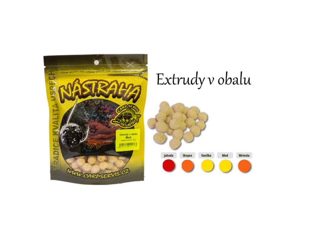 Extrudy v obalu jsou speciální měkkou nástrahou s prodlouženou trvanlivostí nastražení. Po vhození do vody se náhle projasní a zesílí jejich barva, která se pak stává jedním z důležitých aspektů rybolovné úspěšnosti. Atrakční impulzy tato nástraha vydává díky použitým enzymaticky upraveným živočišným bílkovinám, velice intenzivně a dlouho. Extrudy v obalu jsou určeny pro celoroční rybolov.