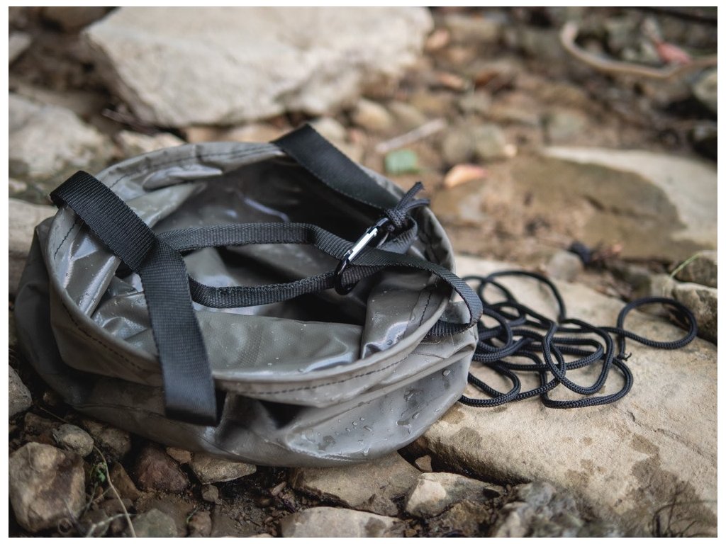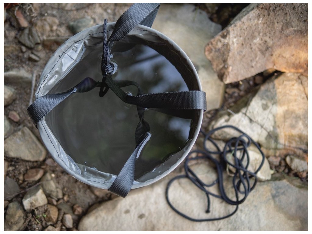 Součástí tohoto vědra je šňůra s karabinou, díky tomu můžete snadno nabrat vodu z lodi, nebo vyššího břehu.