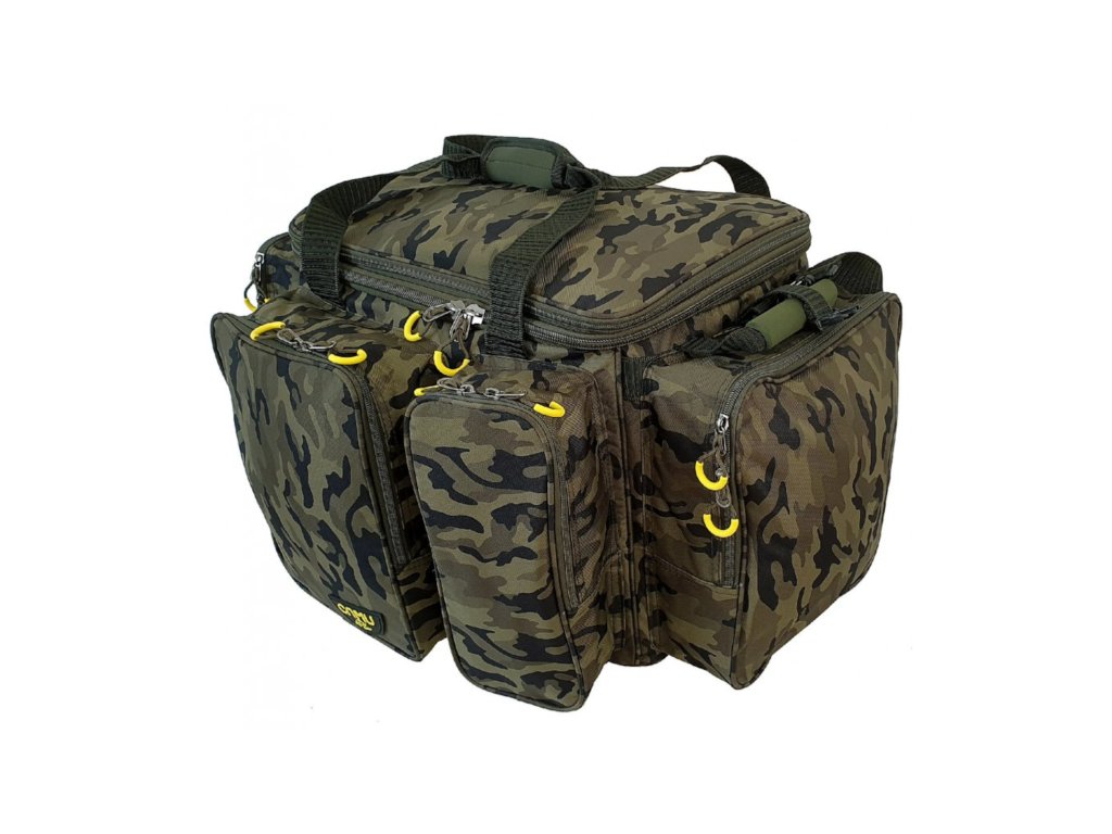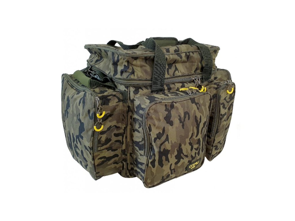 Díky důmyslně všitému zipu lze hlavní prostor navýšit o dalších 10 cm. Taška dále disponuje volným platem na nástrahy a pod. Plato lze připnout karabinami k vrchní části tašky. Tato taška má dvě madla do ruky a polstrovaný popruh přes rameno a dále dvě speciální madla pro snadnější manipulaci - ukládání do auta, nošení ve dvou a pod.